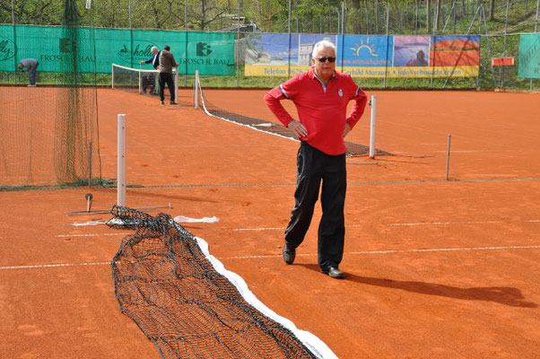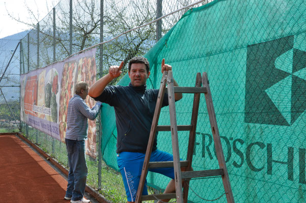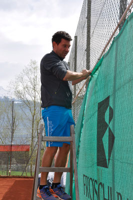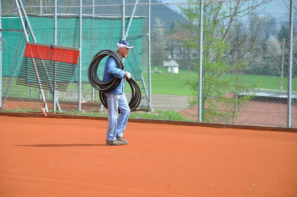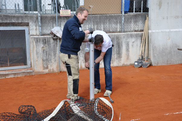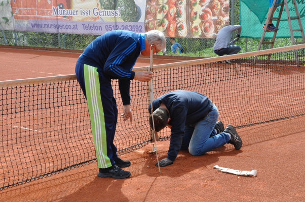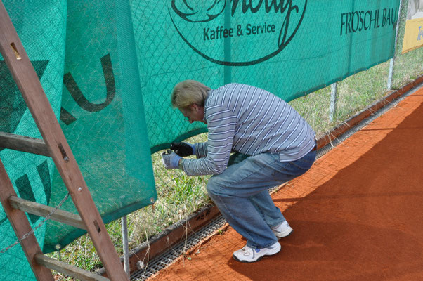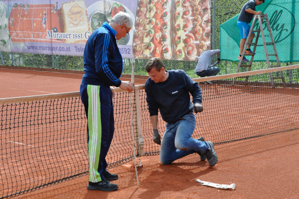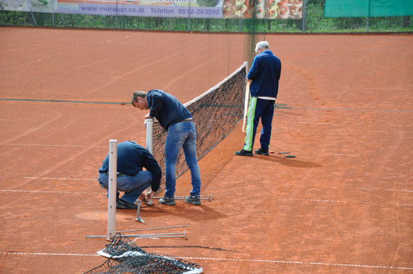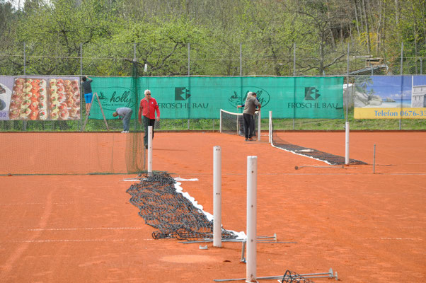 Das schöne und warme Wetter im März ermöglichte auch heuer wieder ein früheres Aufrichten der Absamer Tennisplätze. Die vielen Helfer konnten schon am Freitag, 7. April bestens präparierte Sandplätze bestaunen. Bereits am Montag zuvor wurden die Plätze nämlich gewalzt und am Mittwoch mit neuem Sand bestückt. Dennoch gab es am Freitag noch mit dem Aufhängen der Netze, der Installierung neuer Planen und unzähligen Reinigungs- und Aufbauarbeiten genügend zu tun, um unsere Anlage in bewährtem Glanz erscheinen zu lassen.